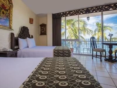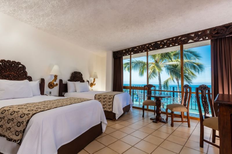 Bellamente decorada en estilo colonial mexicano, con una exclusiva colección de muebles de madera tallada por artesanos mexicanos. Habitación con dos camas dobles, balcón privado con vista al mar, aire acondicionado con control climatico en la habitación, cuarto de baño con ducha, secadora de cabello, teléfono directo, caja fuerte elctronica, TV por cable y puerta de cerradura electrónica.